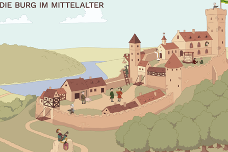 Erleben Sie die interaktive Webanwendung „Die Burg im Mittelalter“ ganz bequem von zu Hause aus. Klicken Sie die Figuren auf dem Startbildschirm an und entdecken Sie Schritt für Schritt das Leben auf einer mittelalterlichen Burg.